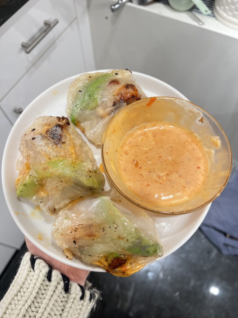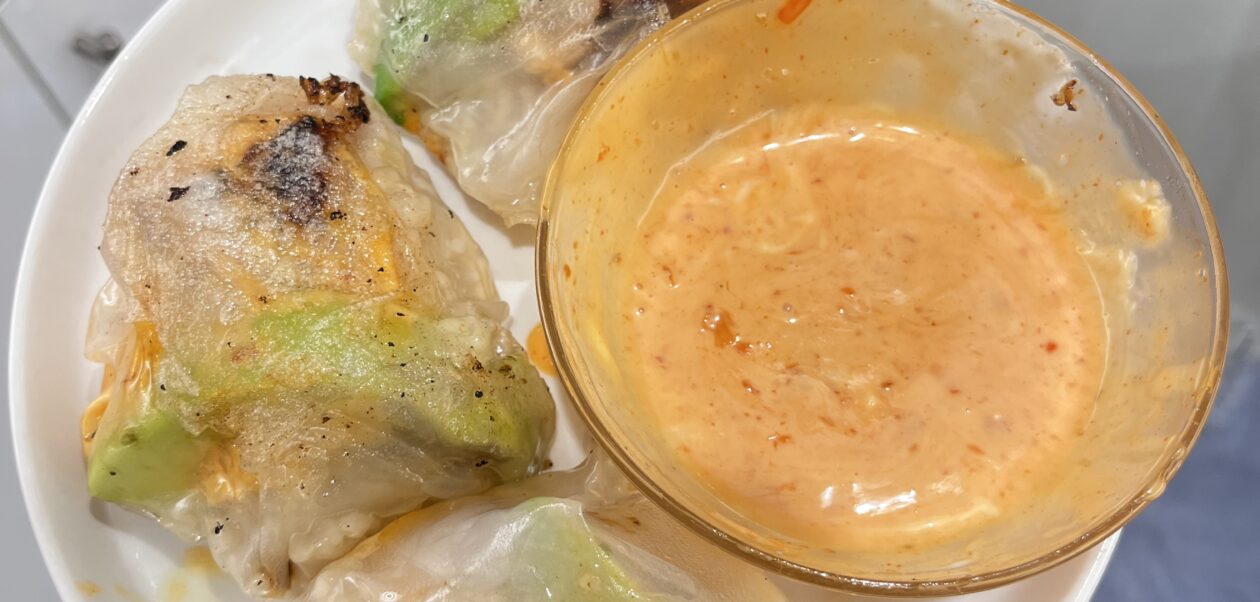 - Layer jasmine rice, salmon, bang bang sauce, and avocado in the center of each wrapper. Roll tightly.