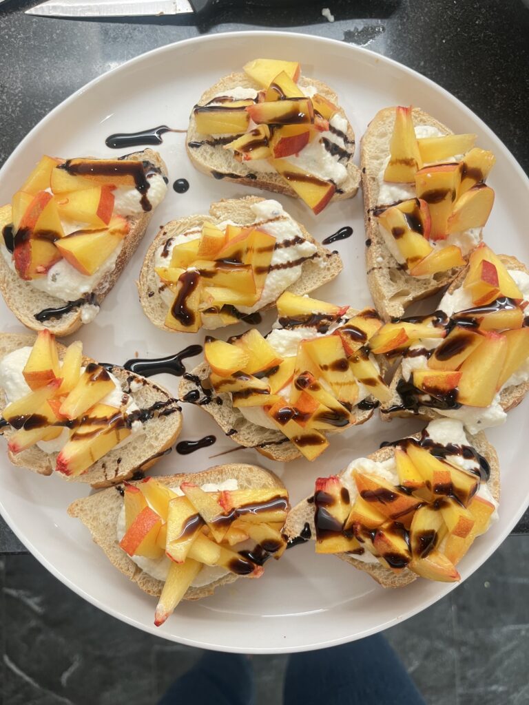 - Spread each piece with the ricotta mixture, then top with a spoonful of peach.